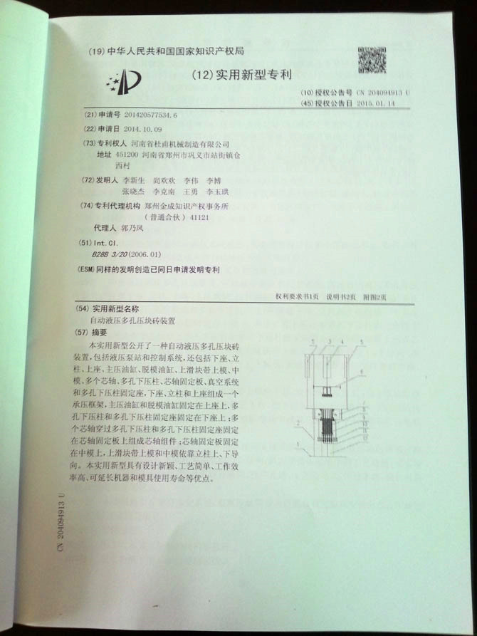 自動液壓多孔壓塊磚裝置新型專利證書
